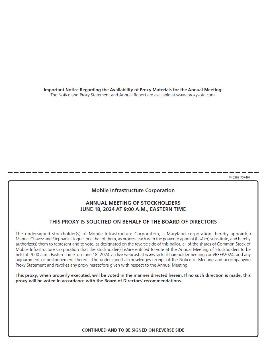 You are cordially invited to the 2024 Annual Meeting of Stockholders (the “Annual Meeting”) of Mobile Infrastructure Corporation (“we,” “us,” “our,” or the “Company”) to be held on Tuesday, June 18, 2024, at 9:00 a.m., Eastern Time.