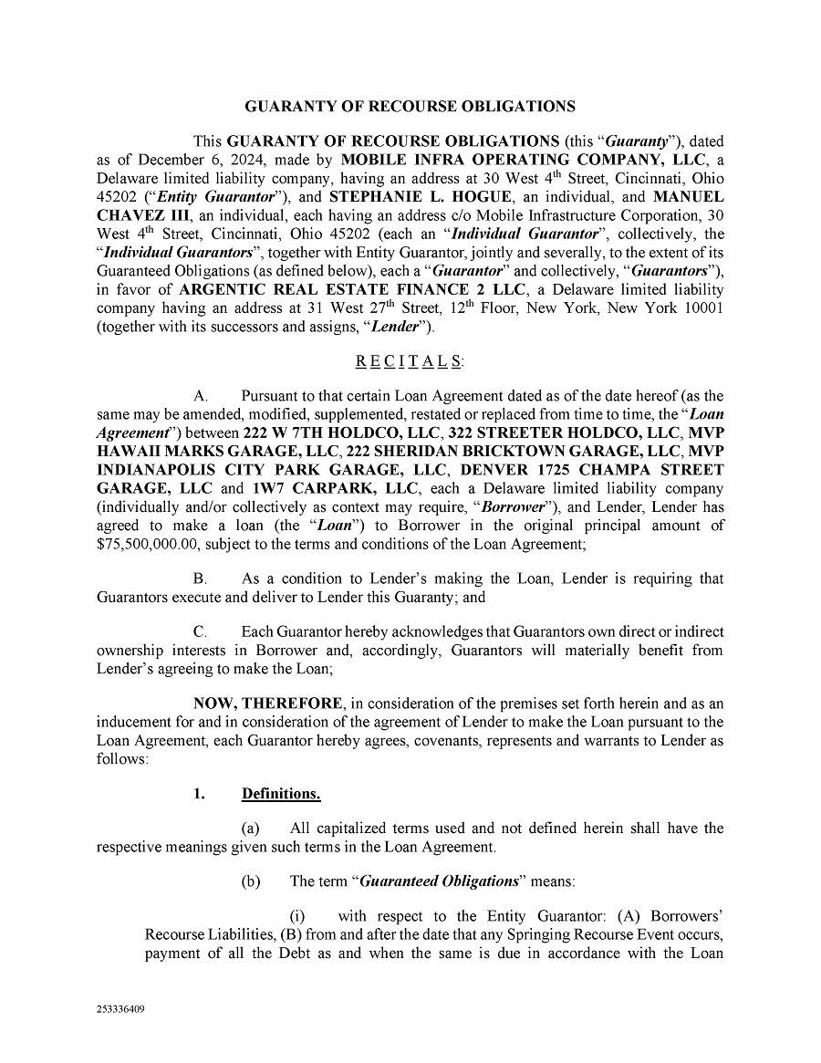 The CMBS Loan Agreement contains customary affirmative and negative covenants, agreements, representations, warranties and borrowing conditions, reserve requirements, and events of default. In addition, and pursuant to the terms of the limited recourse guaranty dated December 6, 2024 (the “Guaranty”) in favor of Argentic, Mobile Infra Operating Company, LLC (the “Operating Company”), serves as a non-recourse guarantor with respect to the CMBS Loan. Under the terms of the Guaranty, the Operating Company is required to maintain a net worth (as defined in the Guaranty) in excess of $40.0 million.